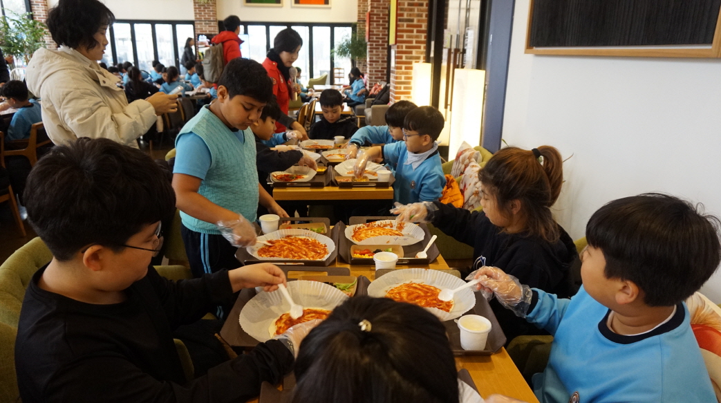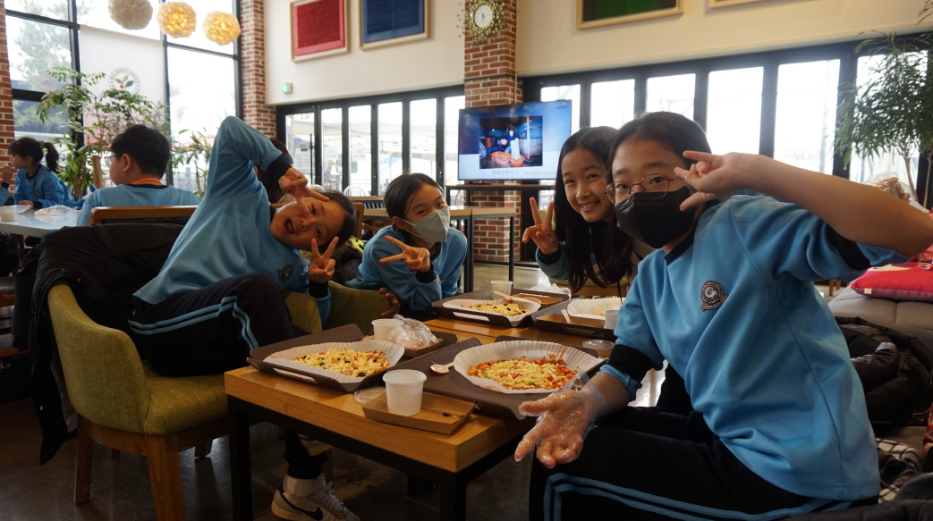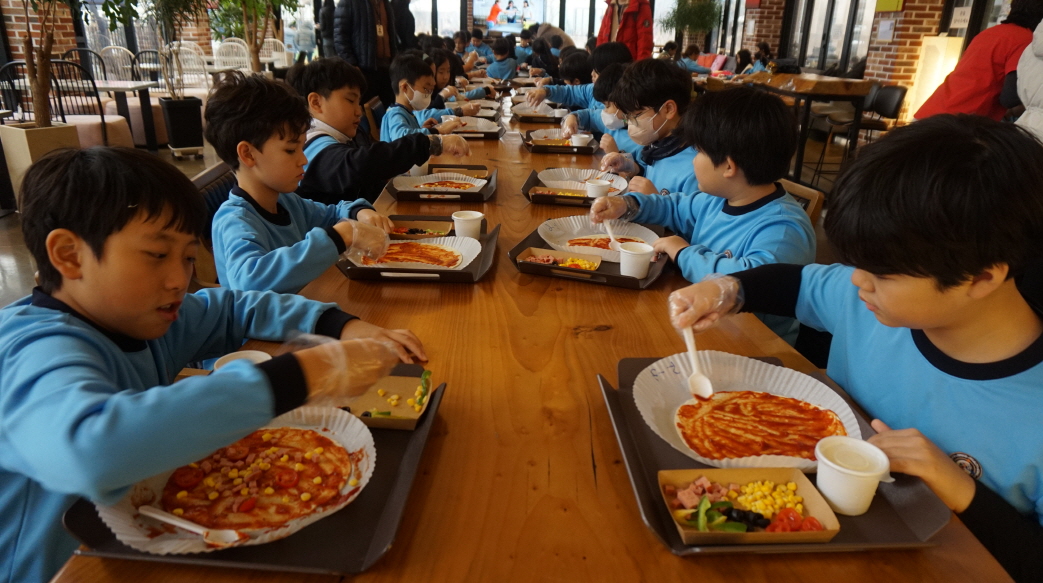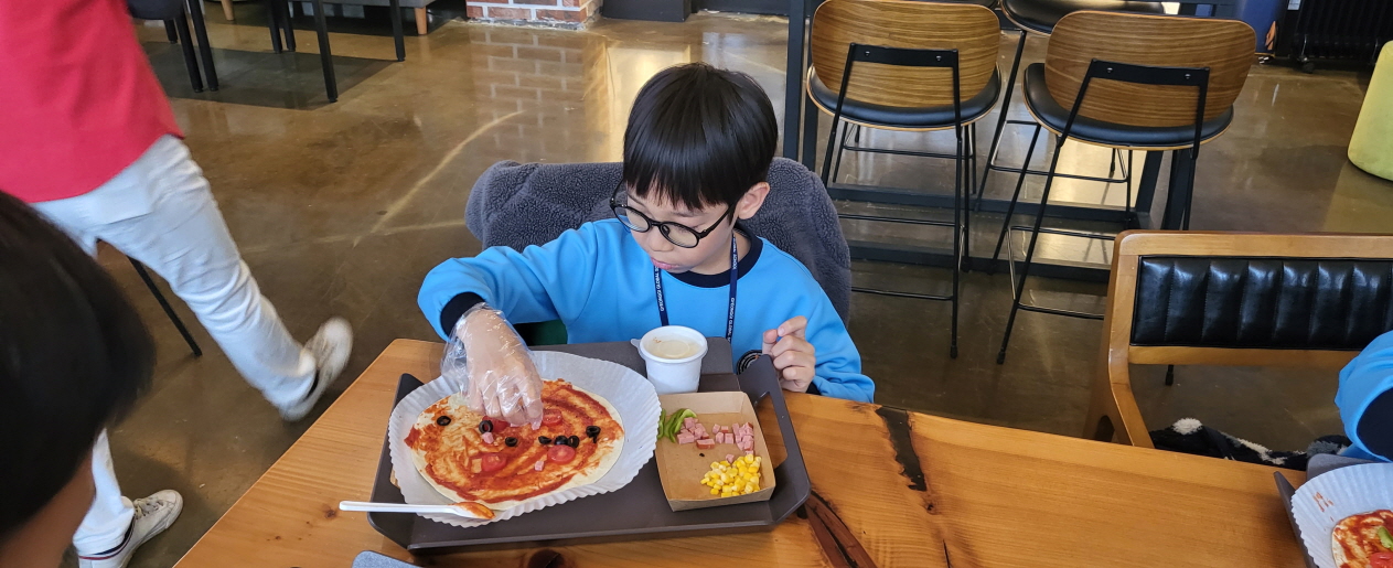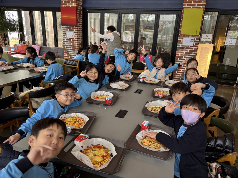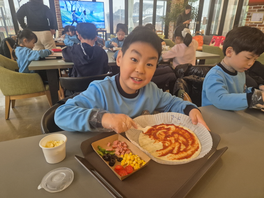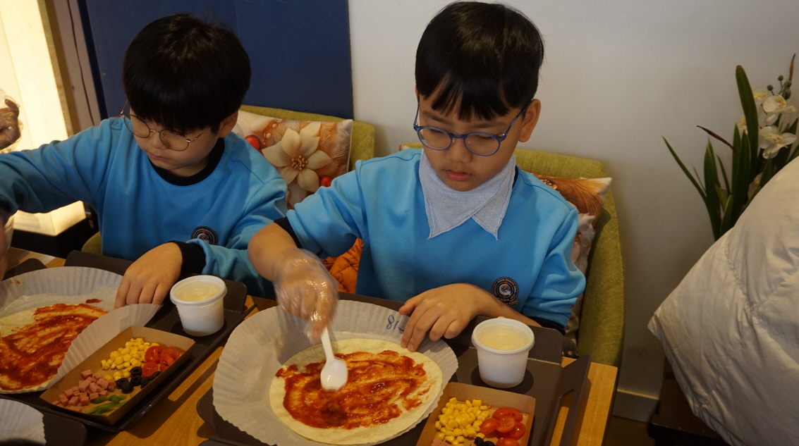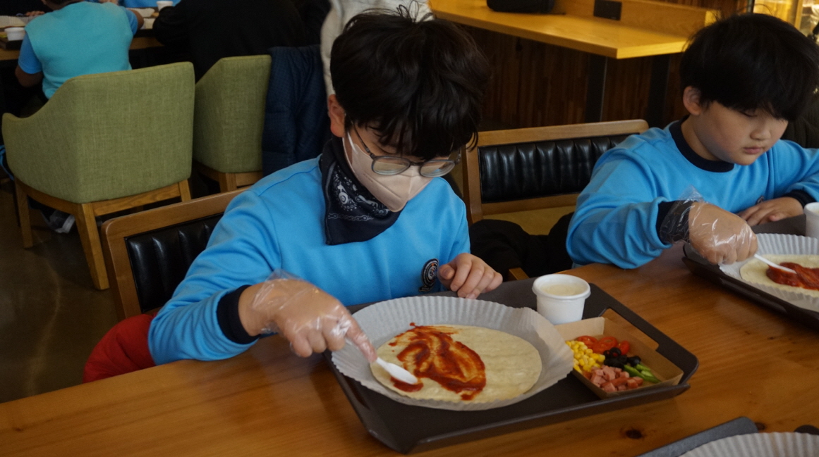 먼저, 피자 만들기 활동을 통해 학생들은 직접 반죽하고 토핑을 올려 완성한 피자를 점심시간에 즐겁게 맛보았습니다.