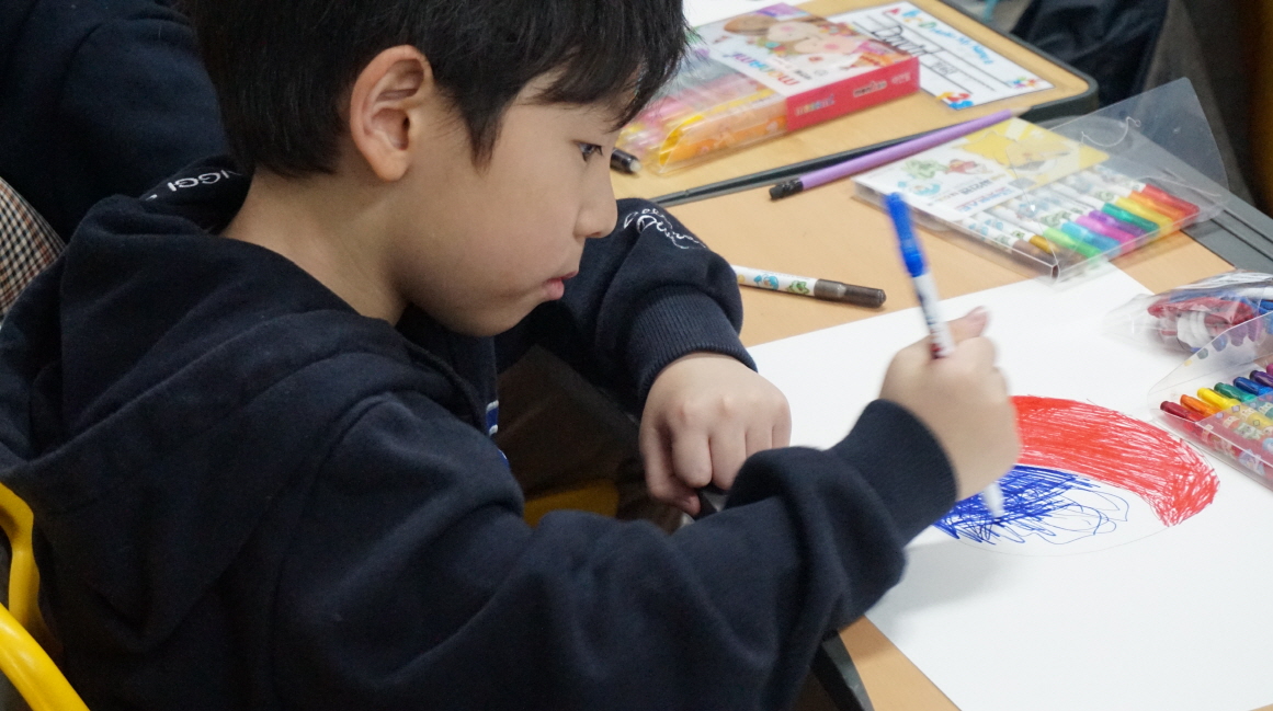 이후 태극기를 직접 그려보며 그 의미를 다시 한 번 되새겼고, 태극기 플라워 키링을 만들어보는 체험 활동도 진행하였습니다.