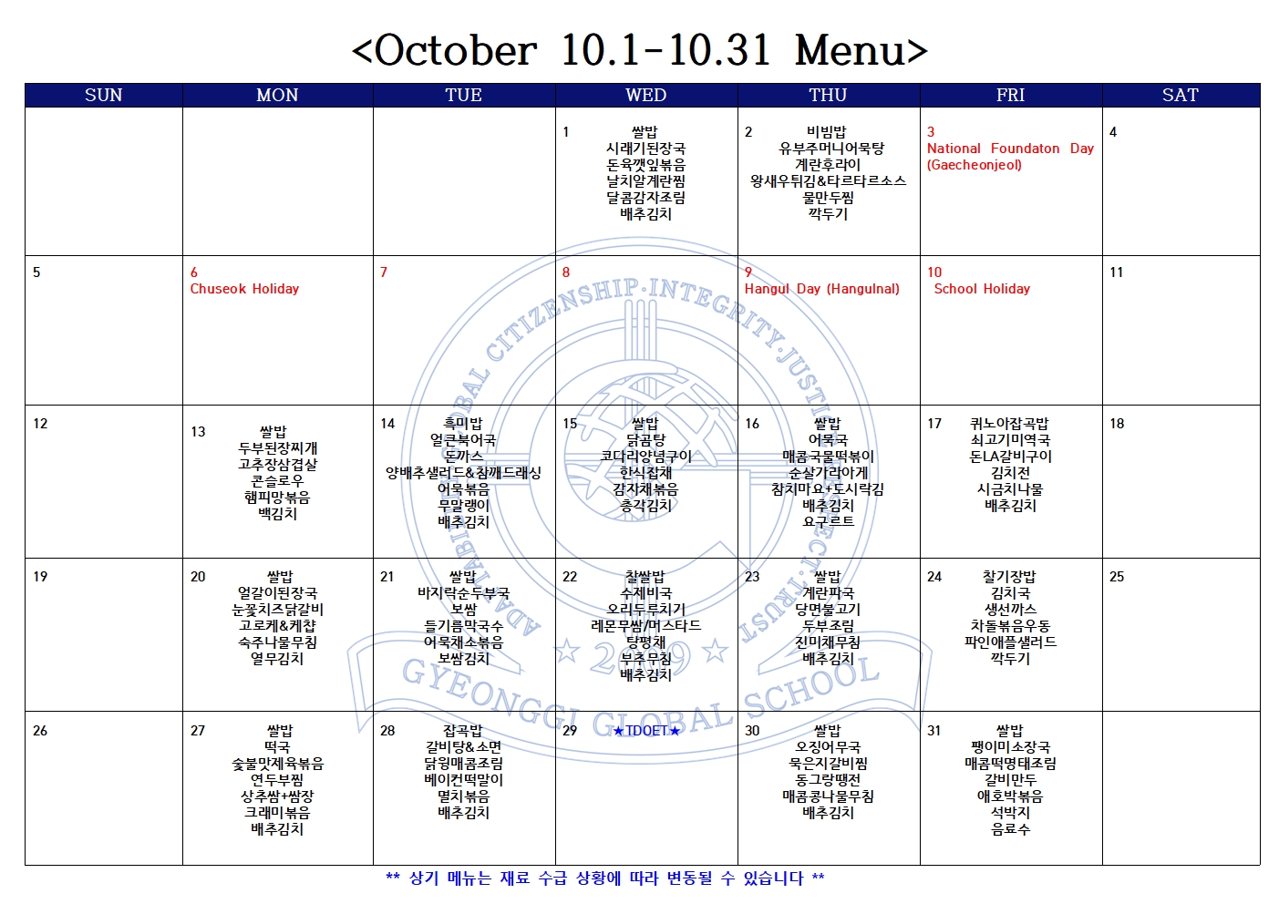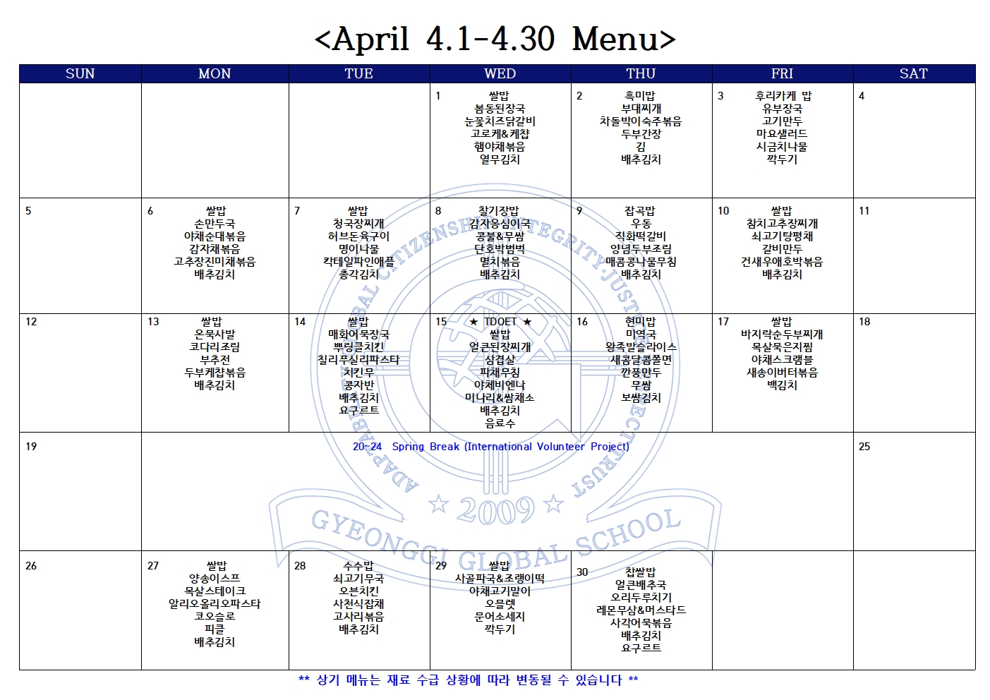 *상기 메뉴는 재료 수급 상황에 따라 변동될 수 있습니다.